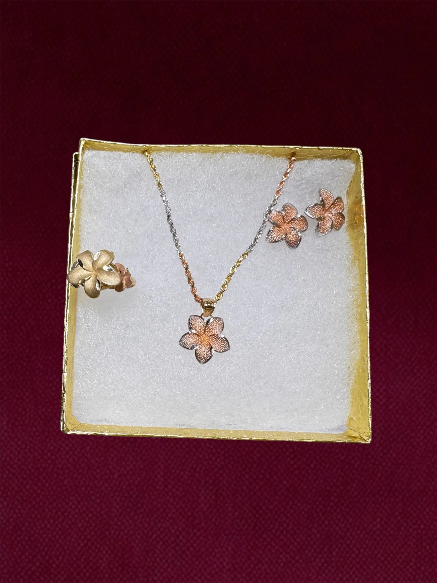 Shop › Hibiscus flower set Image 1 of 1 Hibiscus flower set from $420.00 14kPendant - rose gold Chain - tri- color- rope-16” - 1.7mm solid Earrings- rose gold Ring- Tri color Options: Select Options Only earrings Only ring Chain & pendant All Ring size: Select Ring size 5 6 6.5 7 7.5 8 Purchase Added! 14kPendant - rose gold Chain - tri- color- rope-16” - 1.7mm solid Earrings- rose gold Ring- Tri color